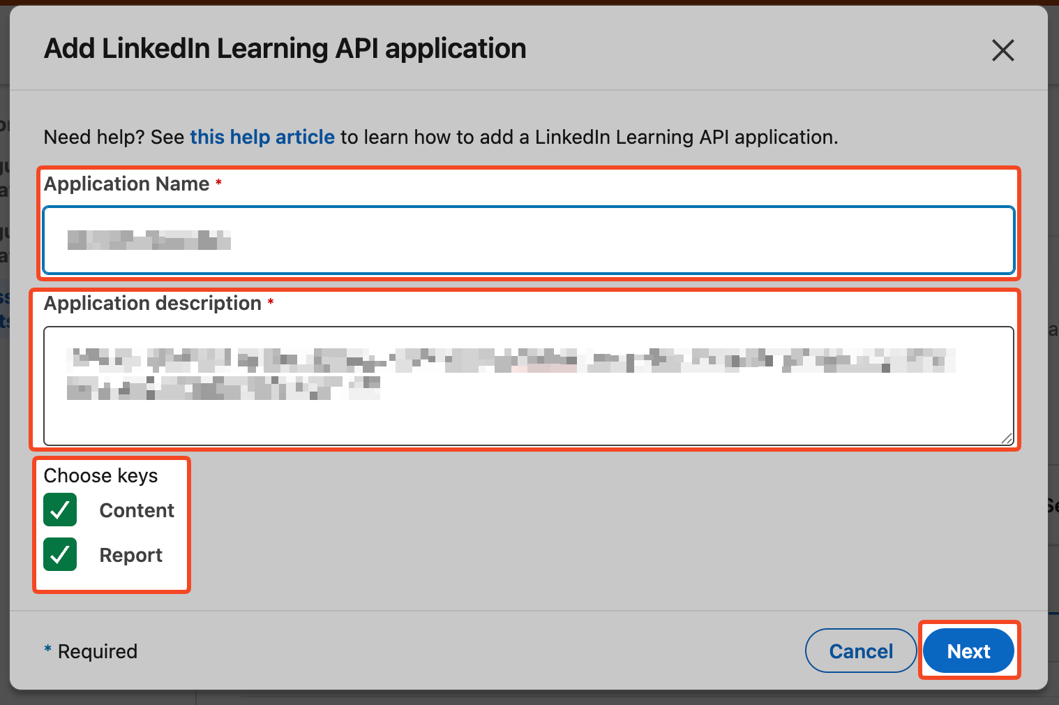 - Fill in a Application Name and Description. Select both Content and Report when choosing keys. Then click Next. Agree to the Terms and Conditions afterwards.