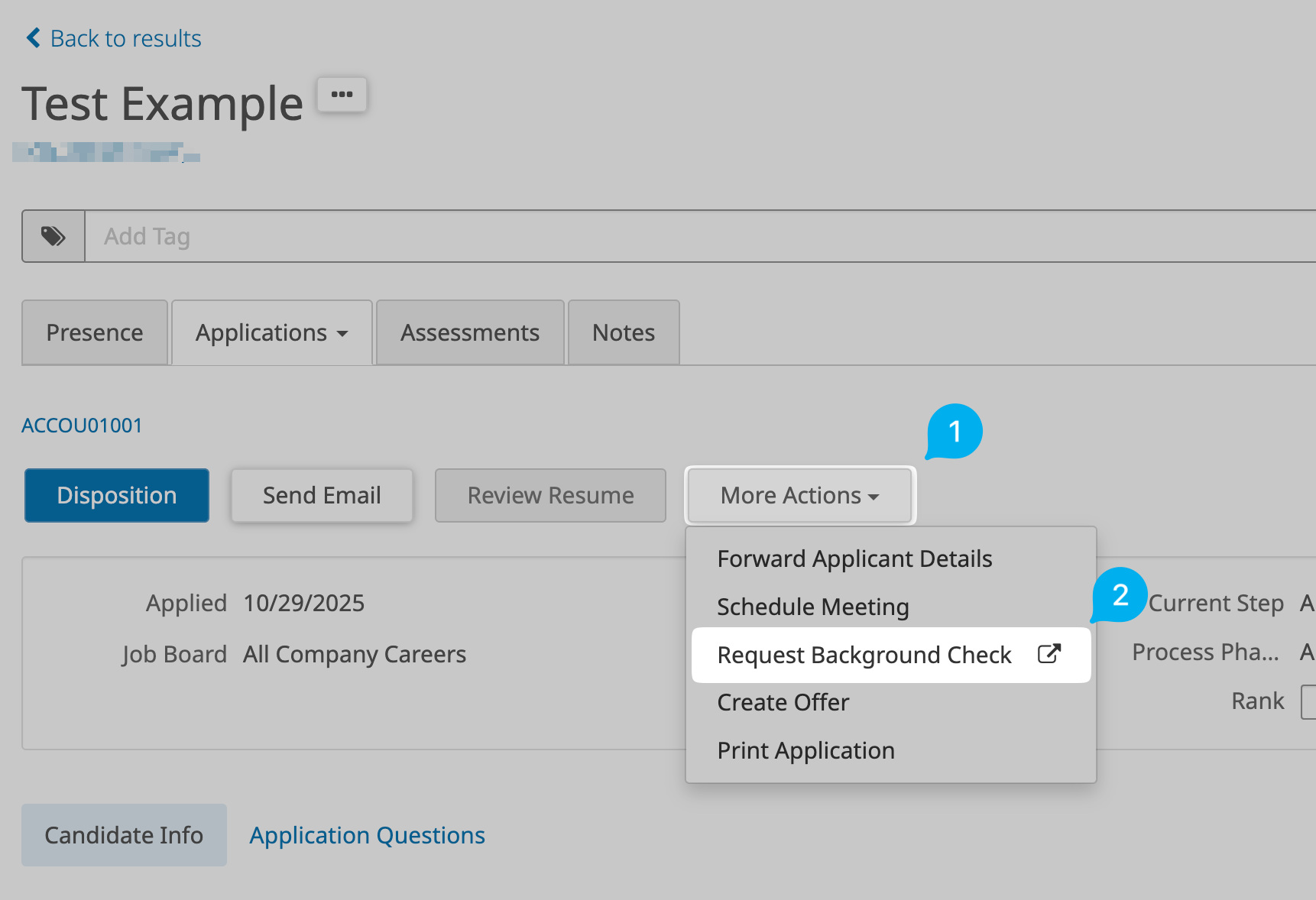 - In the applicant's details page, click "More Actions" and "Request Background Check" from the dropdown: