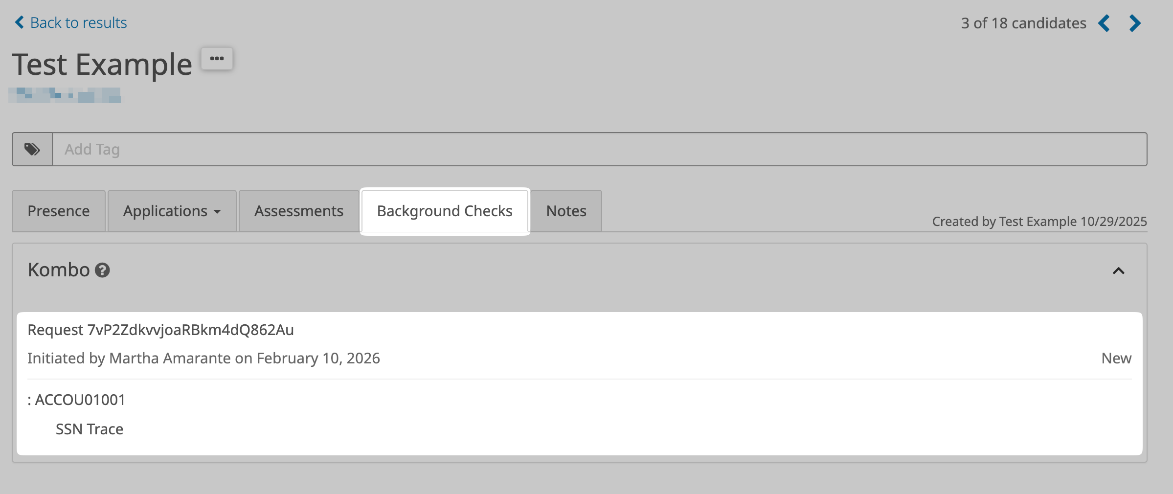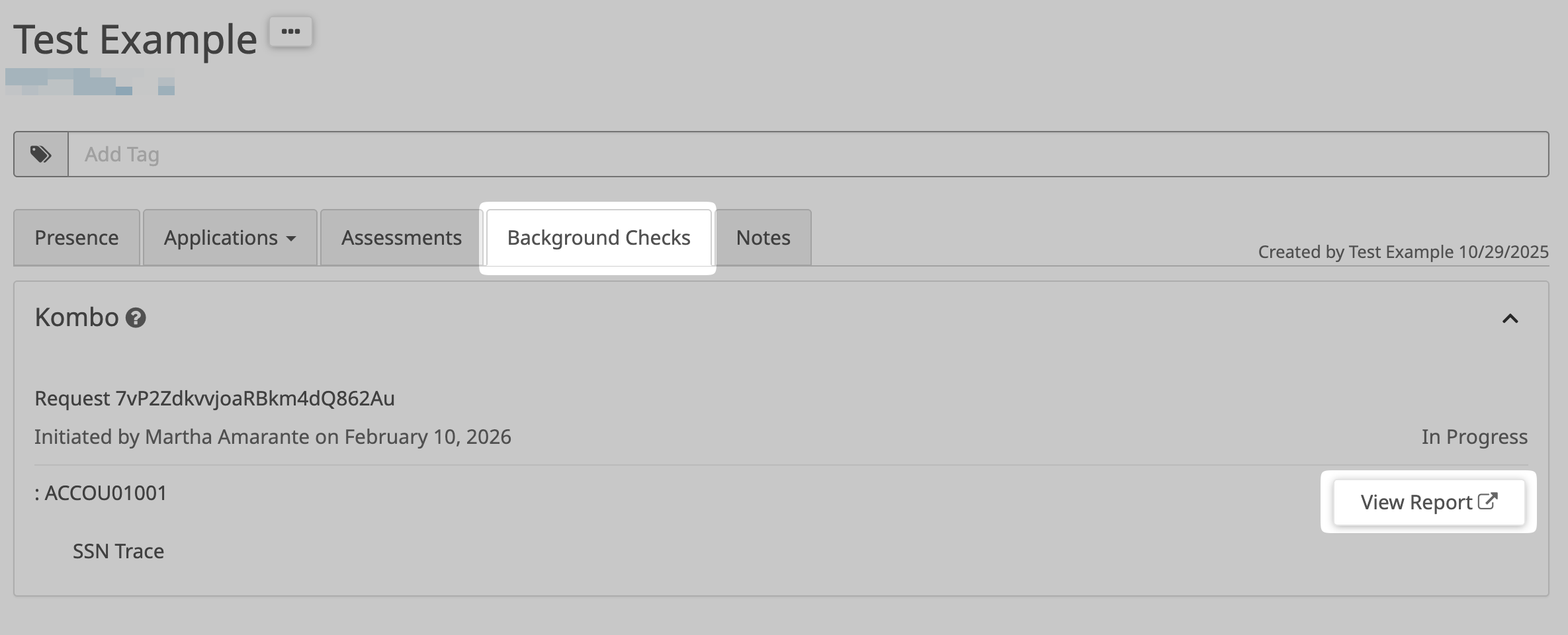 - Once the background check order has been created, you will see the "Background Checks" tab in the applicant's details page as well as the order itself: