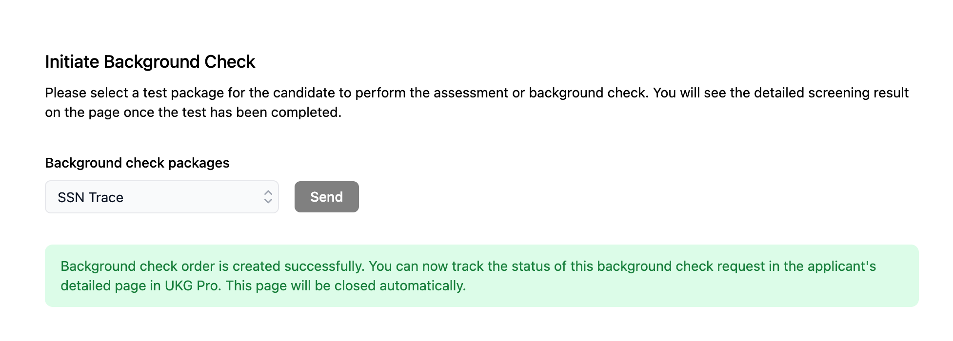 - You will see a successful message once the background check order is created. The redirect page will close automatically afterwards.