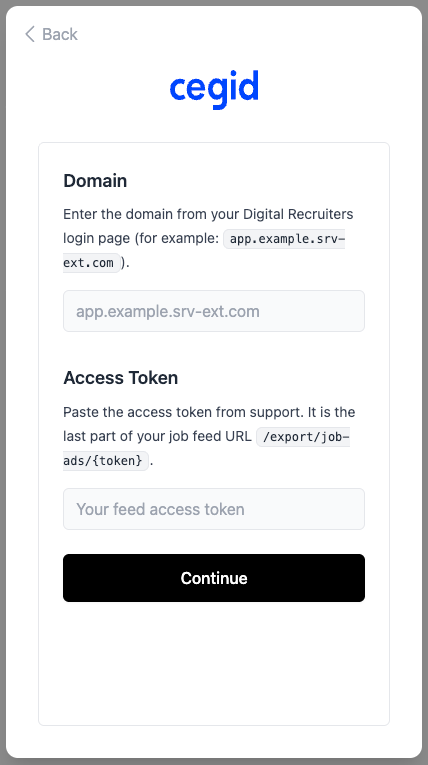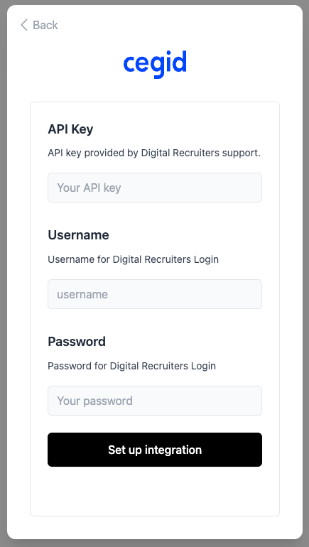 Once you have received the required credentials from Digital Recruiters / Cegid HR, you can proceed to the connection flow and fill it.