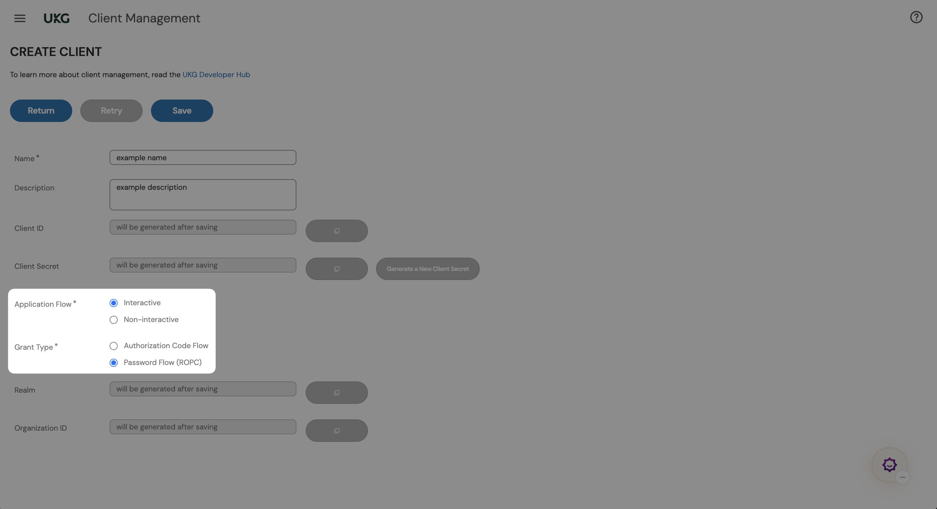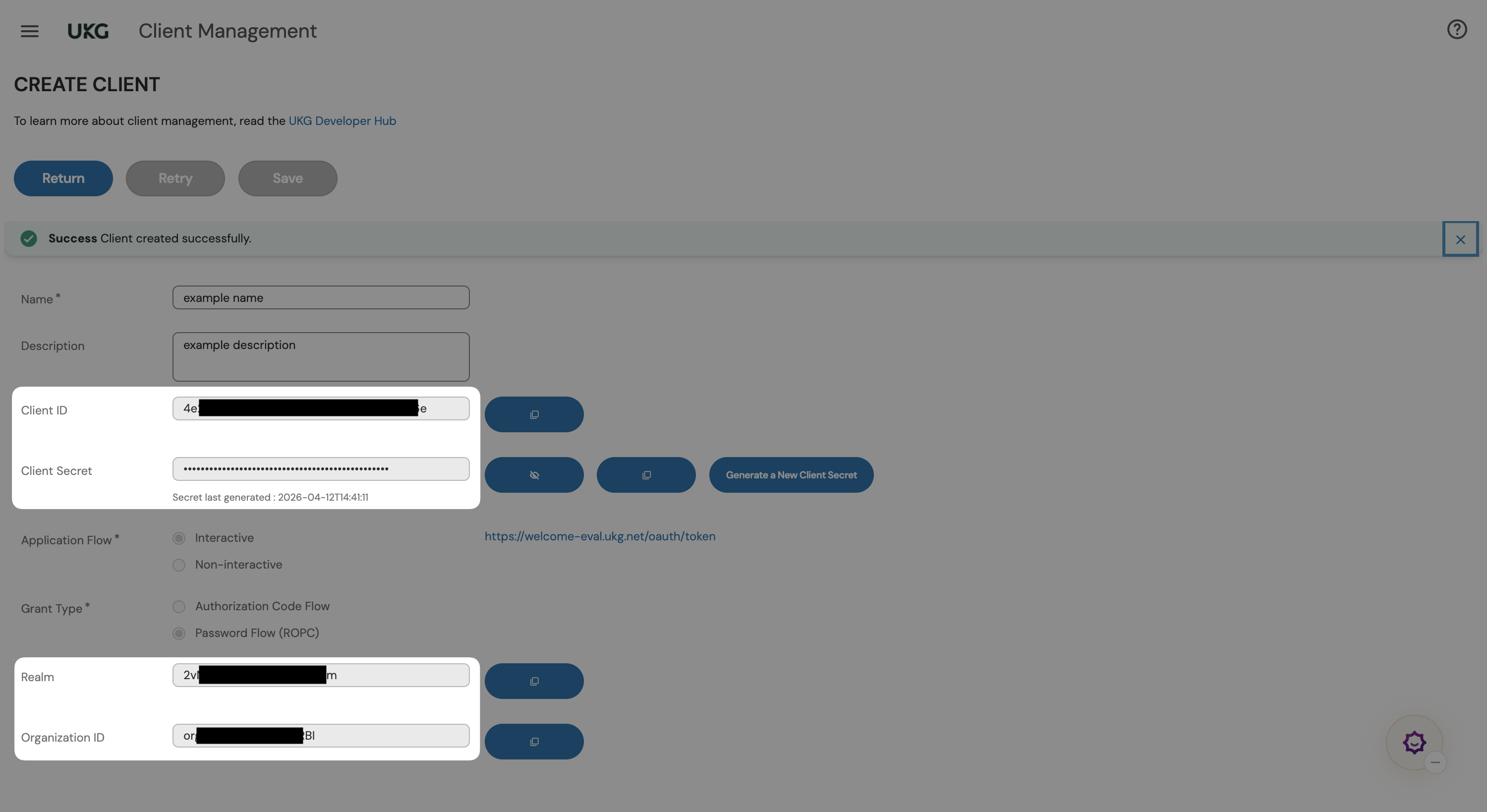 - Click on "Save" and you should be able to see the Client ID, Realm, and Organization ID almost immediately. Please wait for a few seconds for the Client Secret to be generated.