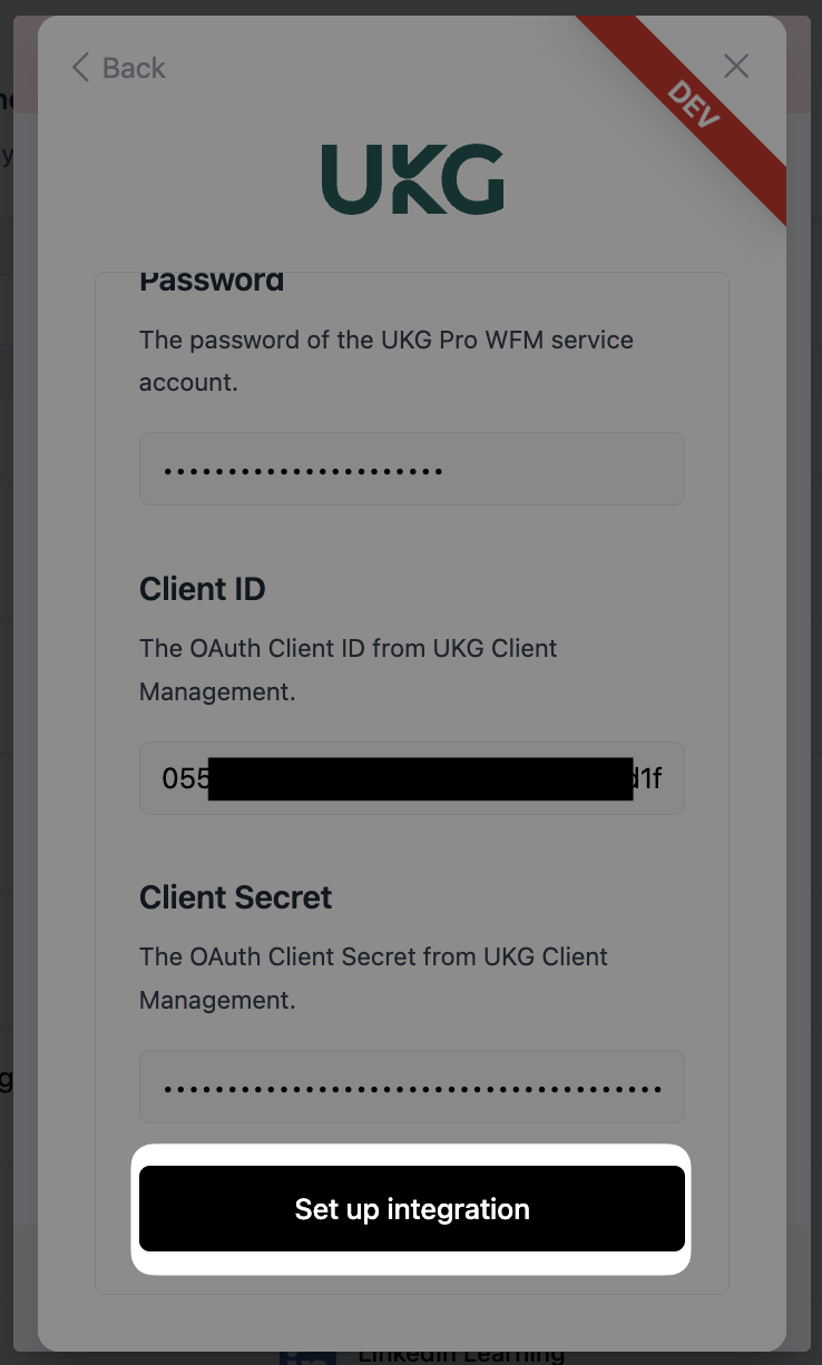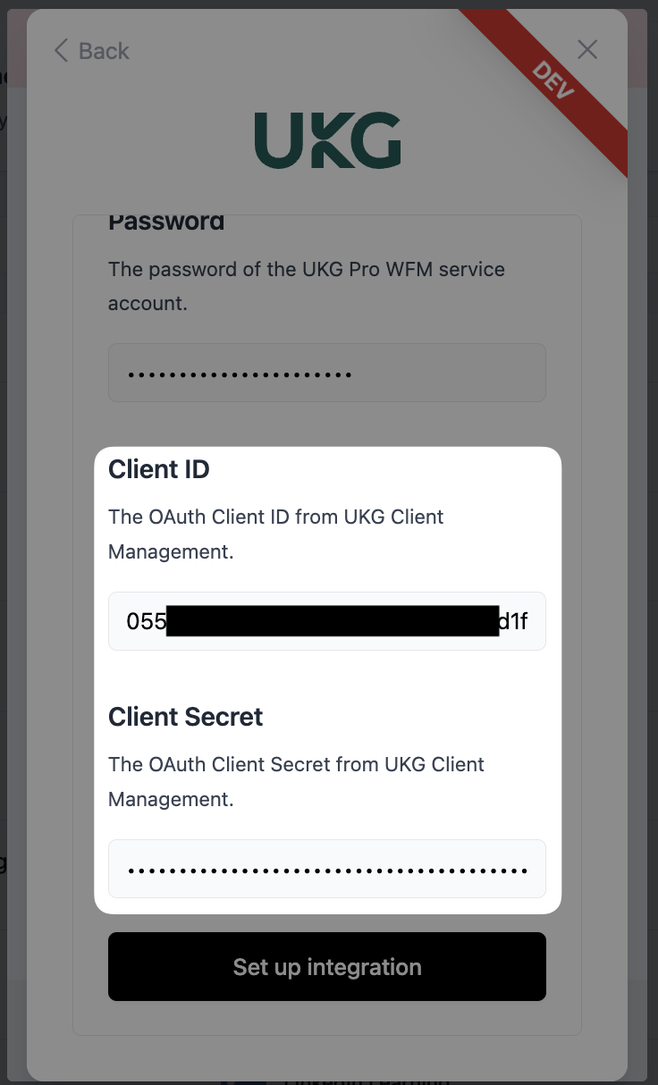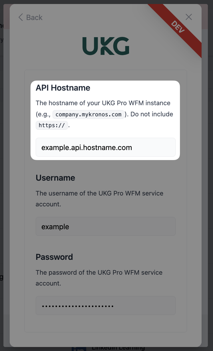 - Please ensure that the person setting up the connection is an Administrator in the UKG Pro WFM instance, otherwise the connection will not work.