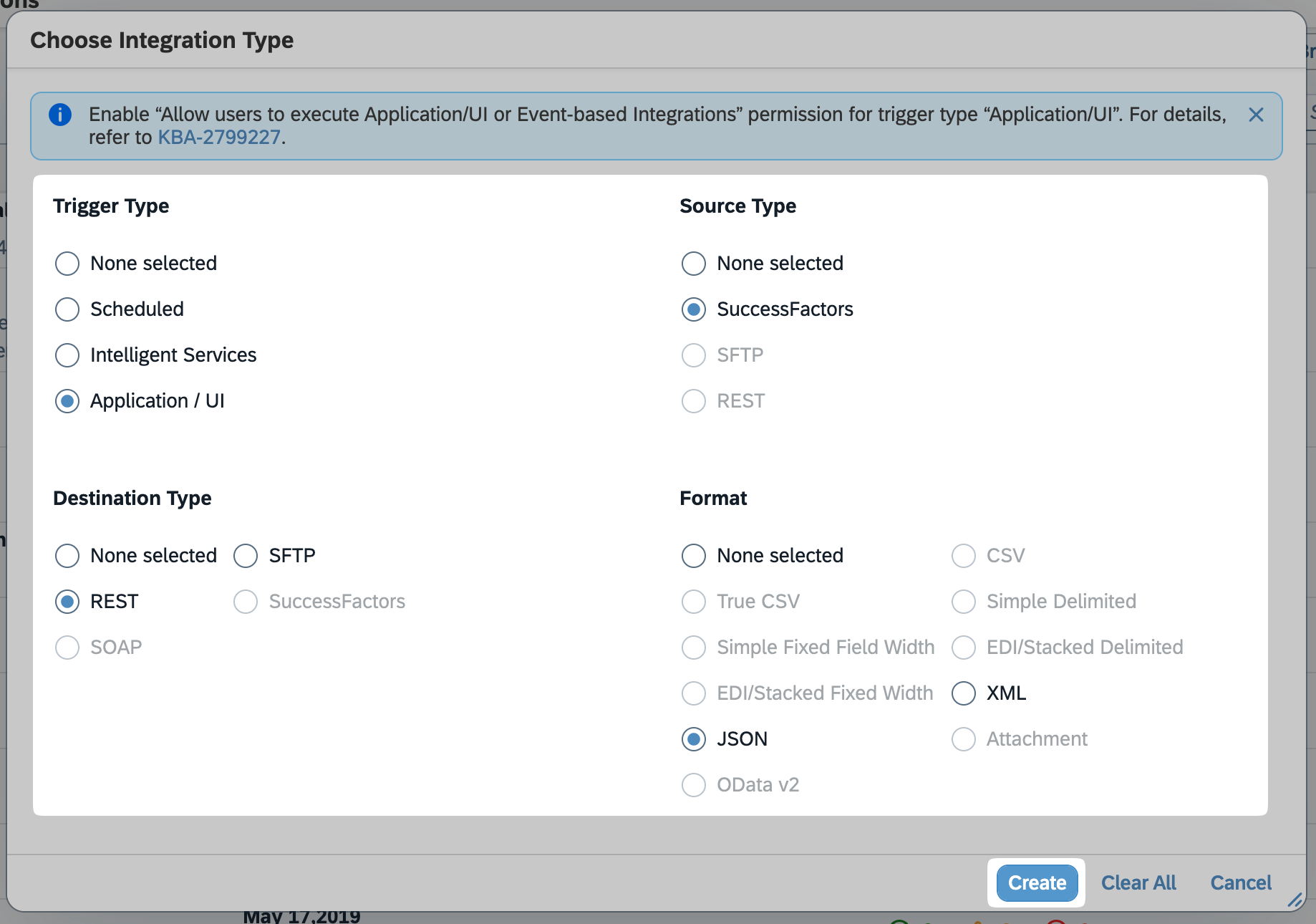 - Make sure the options instructed in the connection flow are selected in the "Choose Integration Type" pop-up, and click on "Create":