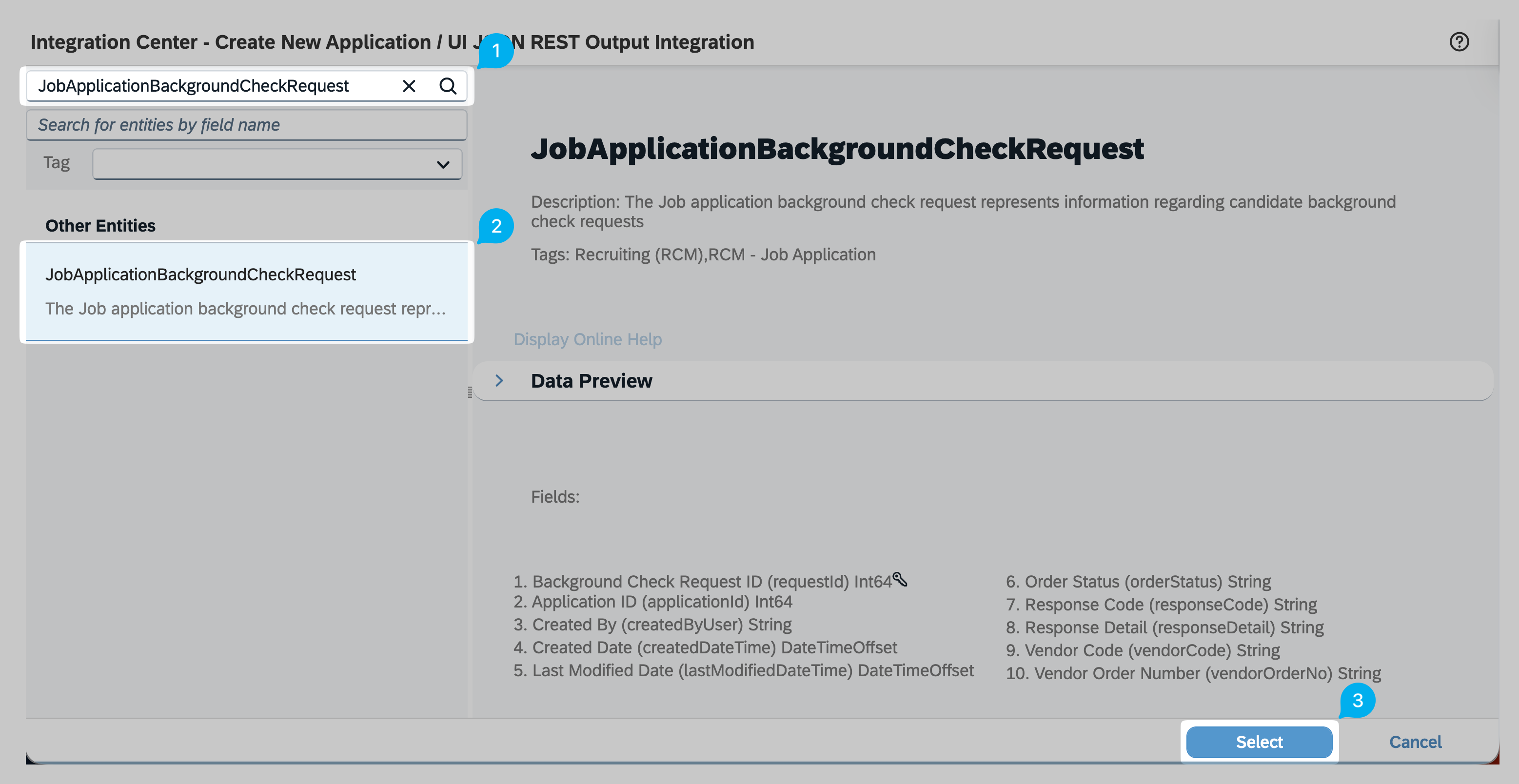 JobApplicationBackgroundCheckRequestin the "Search for Entities by Entity Name" search box, select the entity and click on "Select":