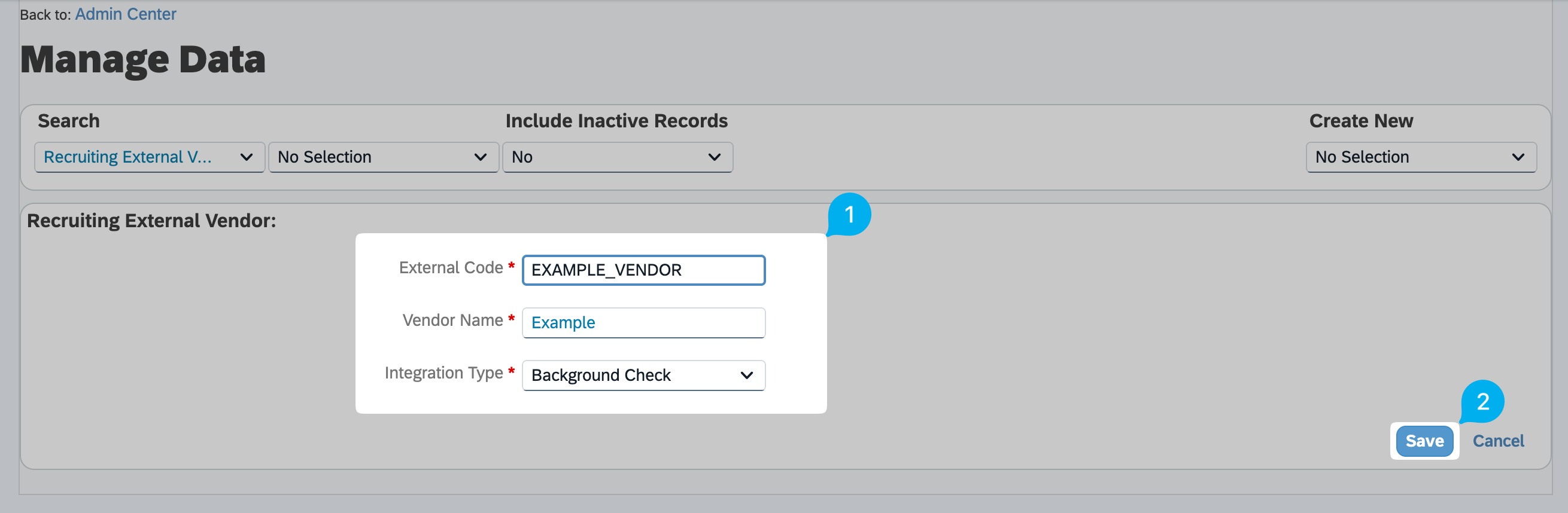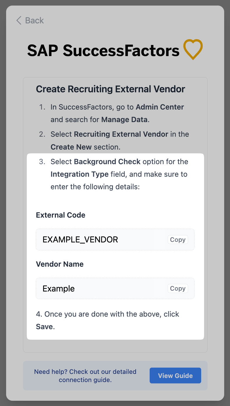 - Enter the Recruiting External Vendor's details instructed by the connection flow, and click "Save":