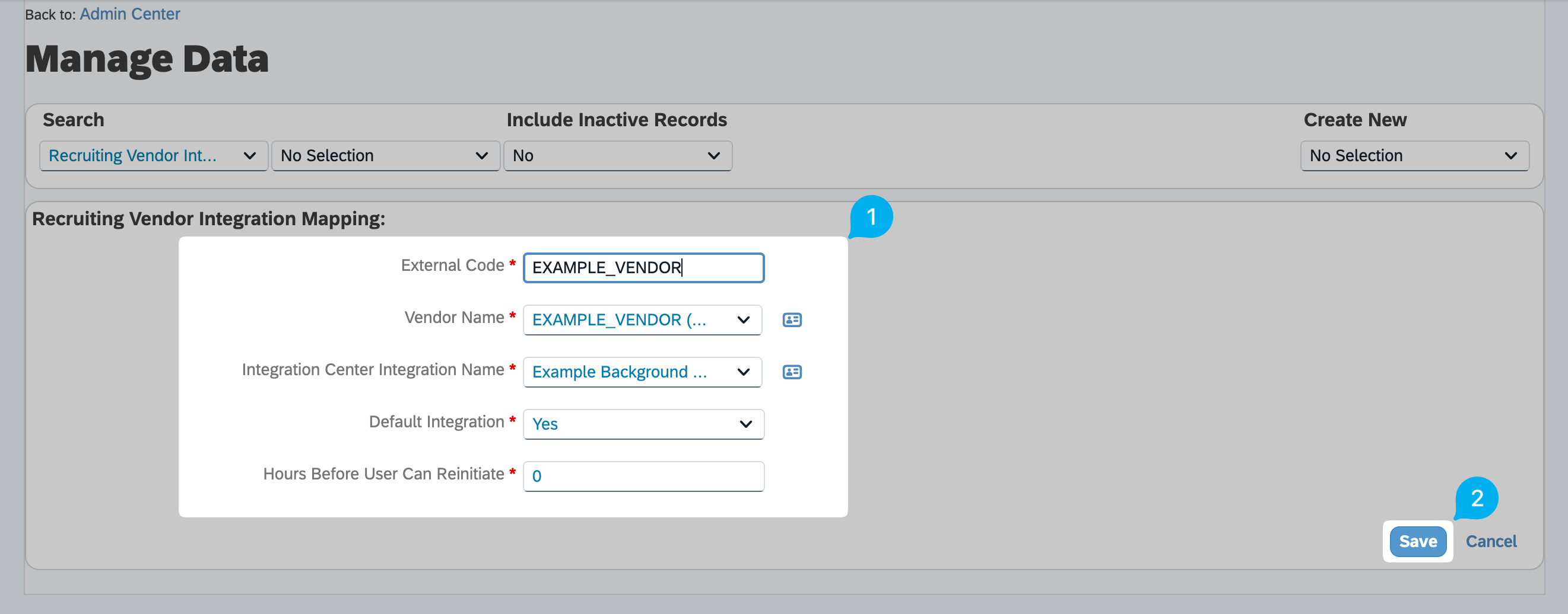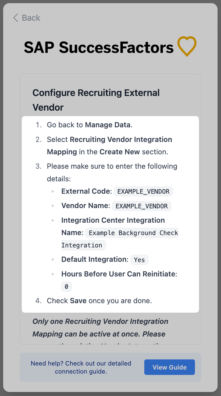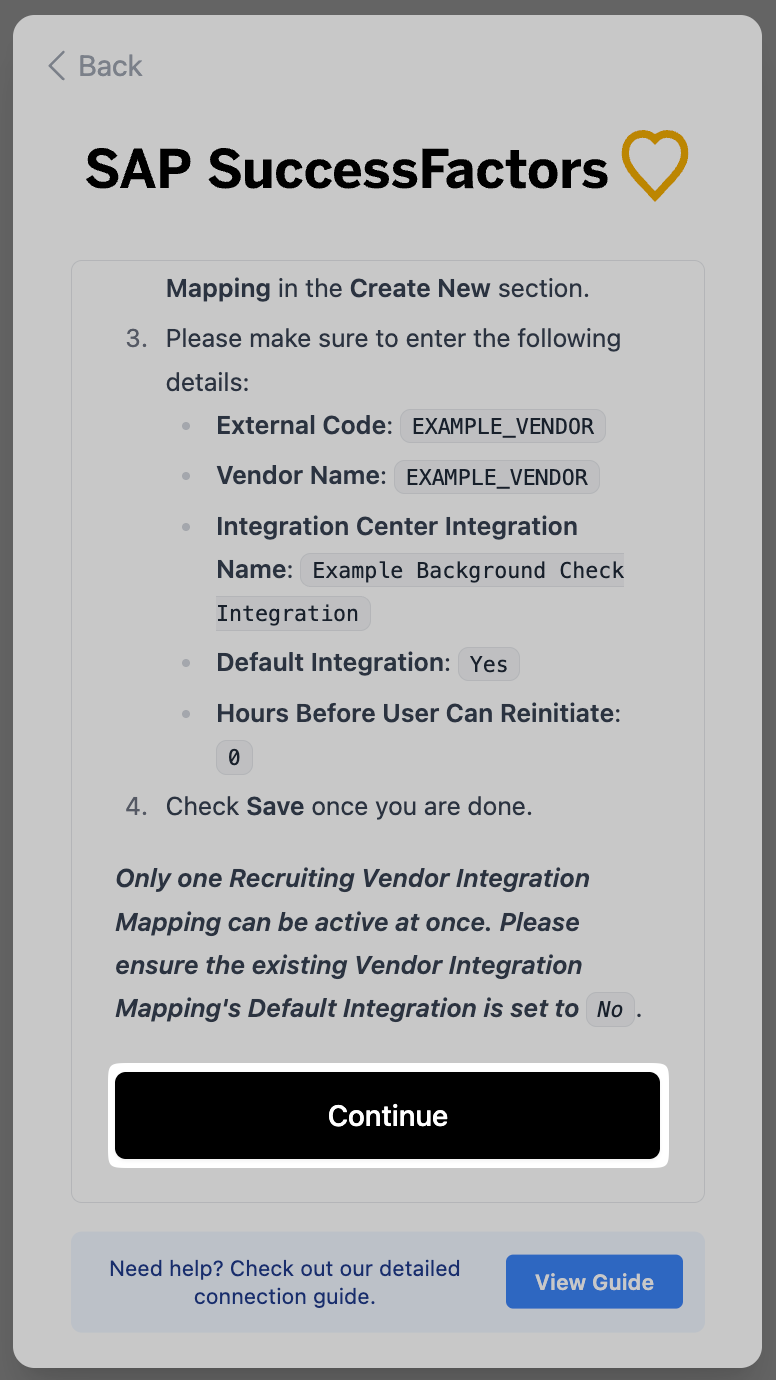 - Enter the Recruiting Vendor Integration Mapping's details instructed by the connection flow, and click "Save":