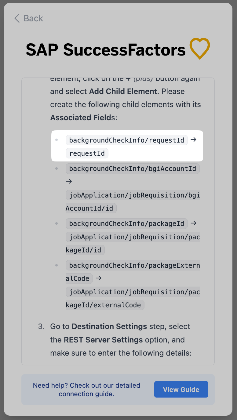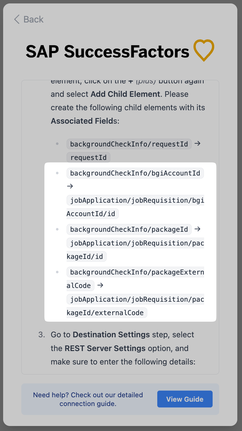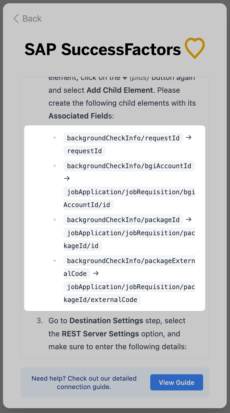 - Enter the Recruiting Vendor Integration Mapping's details instructed by the connection flow, and click "Save":