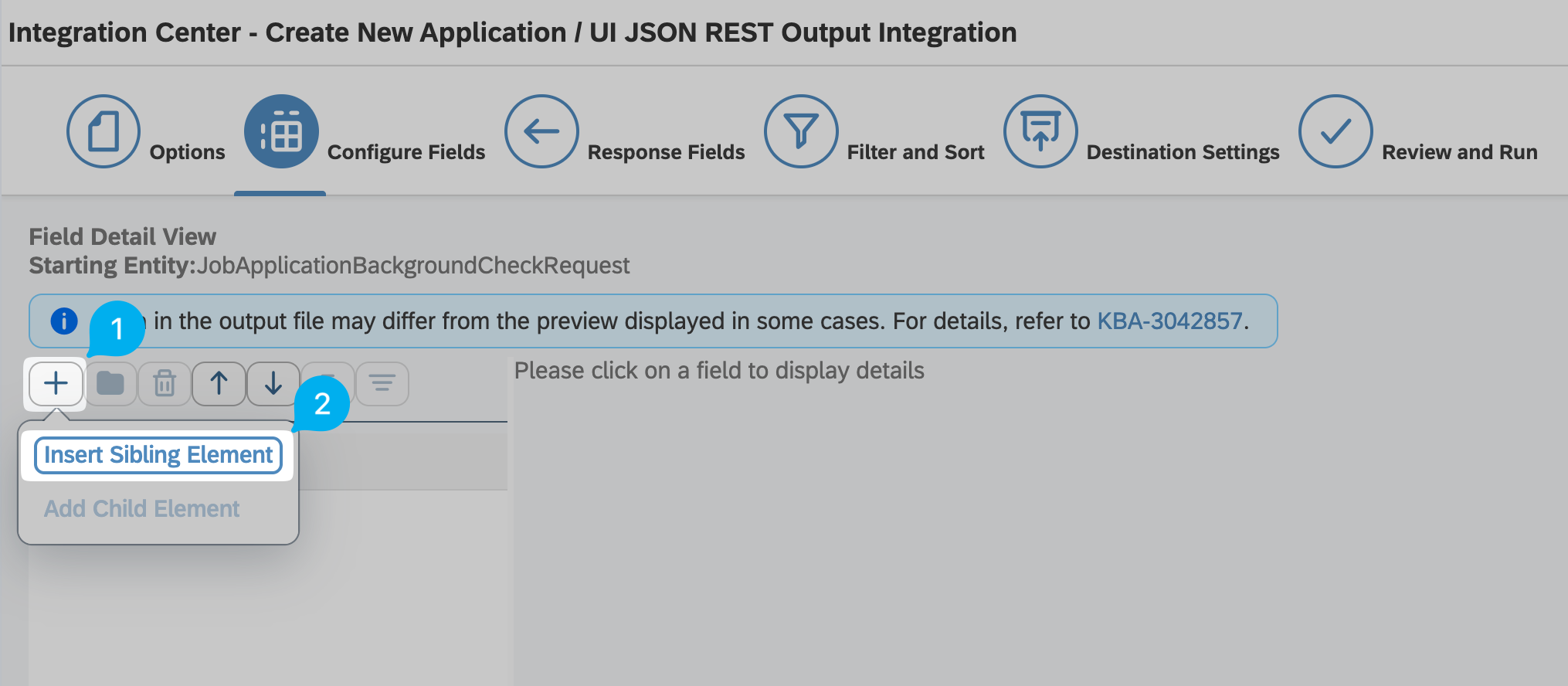 - In the "Configure Fields" step, click on the "plus" button, select "Insert Sibling Element":