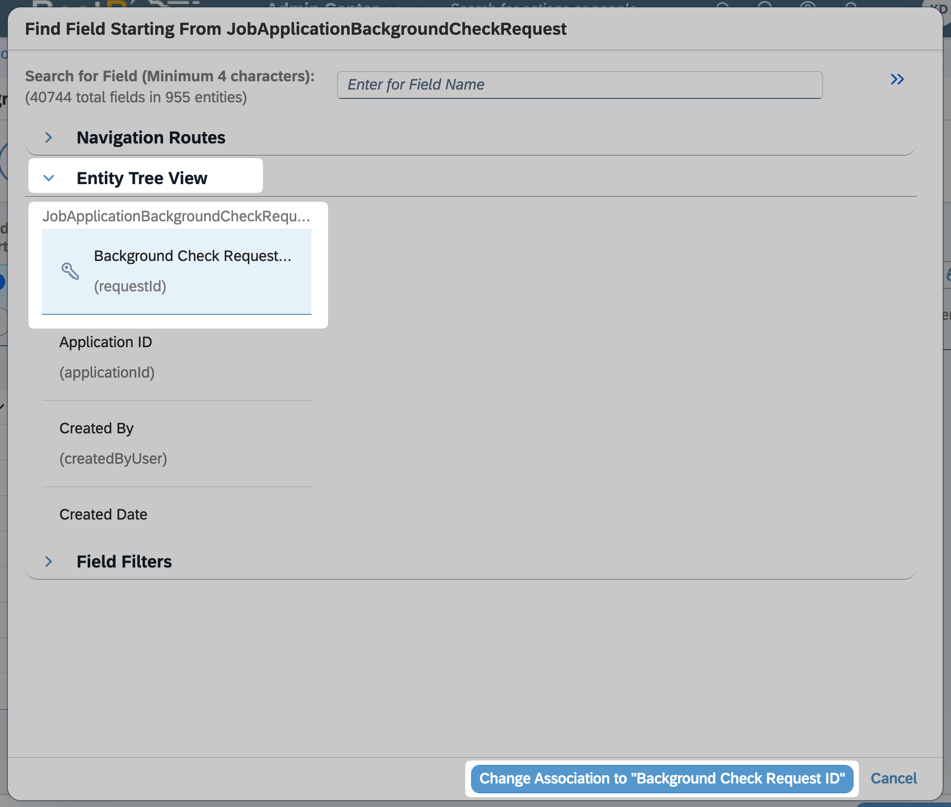 - Select the related field as instructed by the connection flow from the "Entity Tree View" section of the pop-up, and click on the "Change Association to "<PLACEHOLDER_FOR_RELATED_FIELD>"":