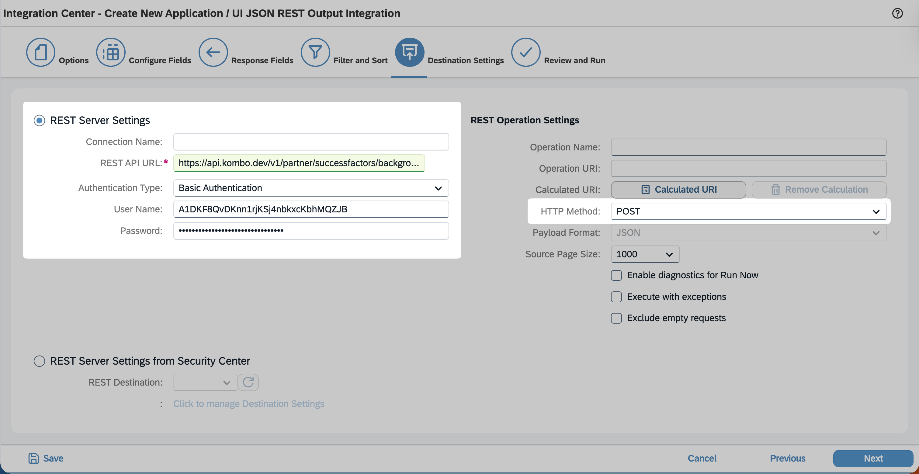 Basic Authentication, and copy the "User Name" and "Password" from the connection flow. Please also make sure the value of "HTTP Method" is set toPOST: