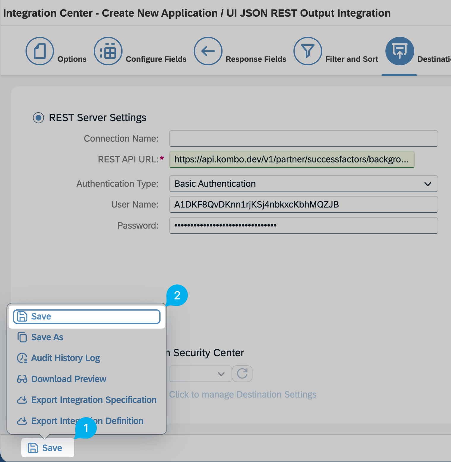 - In the "Destination Settings" step, select the "REST Server Settings" option. Copy the "REST API URL" from the connection flow. Set the "Authentication Type" to