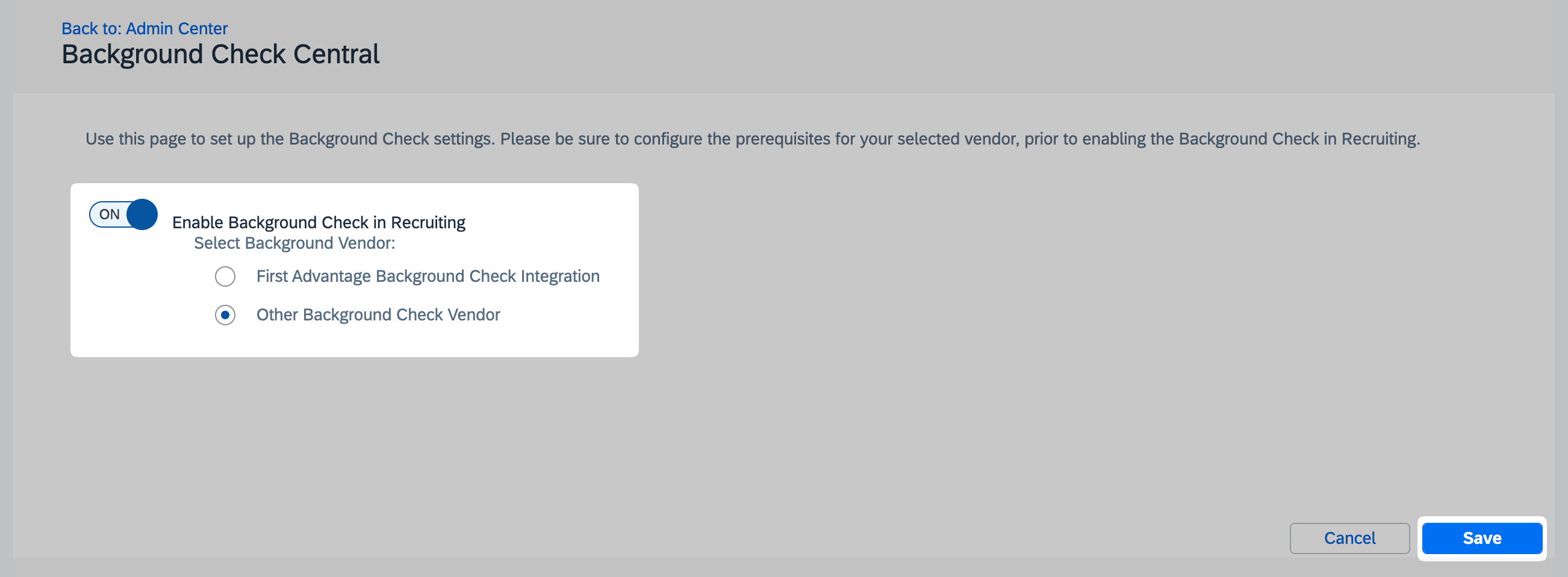 - Make sure the "Enable Background Check in Recruiting" is on, and that the "Other Background Check Vendor" option is selected: